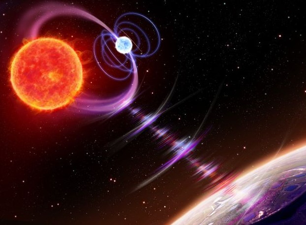 Астрономы выяснили, что две эти звезды находятся так близко друг к другу, что во время своего вращения происходит столкновение их магнитных полей и плазмы, что приводит к выбросу радиоволн, которые распространяются по галактике.