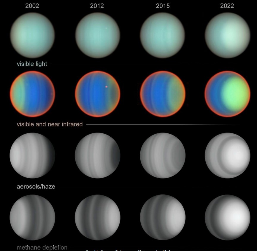 Ученые с помощью данных, собранных с 2002 по 2022 год смогли оставить картину сезонных изменений на Уране. Поскольку ледяному гиганту требуется чуть более 84 земных лет, чтобы завершить один оборот вокруг Солнца, астрономы в основном наблюдали северную весну планеты, но уже в 2030 году там наступит северное лето, когда солнечный свет будет падать на ледяной мир по-другому.