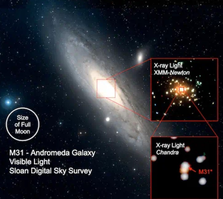Галактика Андромеды состоит из сотен миллиардов звезд и в ее центре, как и в других крупных галактиках, находится сверхмассивная черная дыра под названием M31*. Когда черная дыра поглощает материю, то последняя, перед исчезновением в недрах черной дыры нагревается и выпускает рентгеновское излучение. Его обнаружил космический телескоп Чандра.