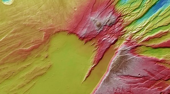 Еще на одной фотографии Mars Express, на этот раз представленной в цвете, видна топография региона Acheron Fossae. Синие и фиолетовые цвета представляют более низкие высоты, а красные и белые — самые высокие точки региона.