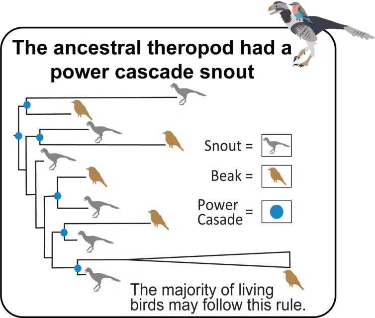 В новой работе ученые исследовали 127 видов теропод и обнаружили, что 95% клювов и морд теропод следуют этому правилу. Команда использовала передовой эволюционный анализ с помощью компьютерн7ого моделирования. Ученым удалось продемонстрировать, что у предкового теропода, вероятно, была зубастая морда, следовавшая правилу каскада мощности. Это может указывать на то, что "каскад мощности" описывает рост не только клювов и морд теропод, но и всех позвоночных, в том числе млекопитающих, рептилий и рыб.
