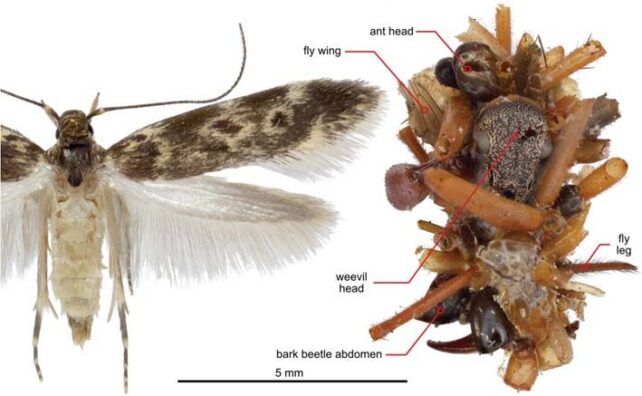 Команда также повела несколько тестов в лаборатории, предложив гусеницам различные детриты для строительства своих маленьких гнезд. Результаты указывают на то, что гусеницы, как правило, выбирали только части тела других насекомых или сбрасывали кожу паука, избегая кусочков веточки, листа или коры. А когда им не предлагали частей насекомых, гусеницы не принимали ничего другого: либо кусочки насекомых, либо ничего.