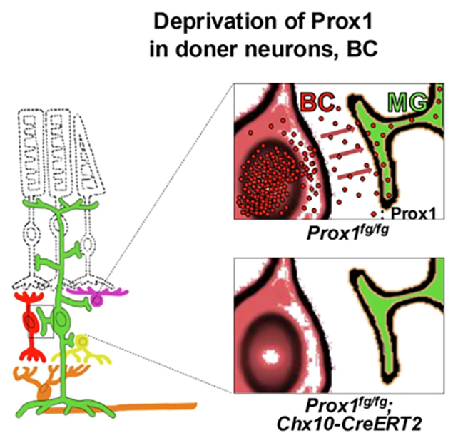После повреждения сетчатки Prox1 проникает в опорные клетки, известные как глиальные клетки Мюллера (MG), препятствуя их способности восстанавливать нервные клетки. Эти клетки MG обладают регенеративными свойствами у некоторых животных, но у млекопитающих Prox1 блокирует это.