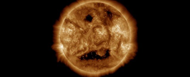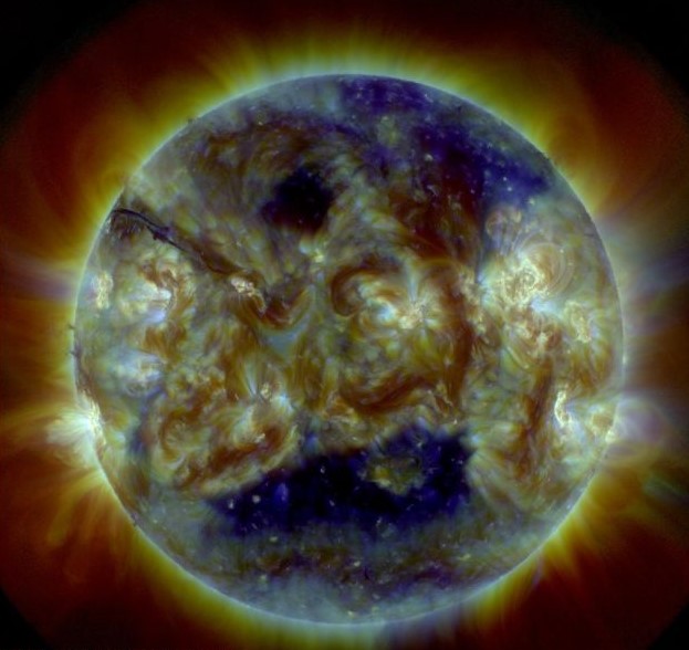 В настоящее время конфигурация корональных дыр на Солнце напоминает кричащее лицо с широкой, похожей на рот дырой в южном полушарии и двумя похожими на глаза дырами в северном полушарии звезды.