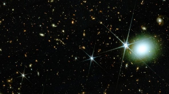 Астрономы говорят, что возможности телескопа Уэбб превзошли все их ожидания и он смог увидеть даже самые тусклые галактики, свет от которых летел к нам более 13 млрд лет.