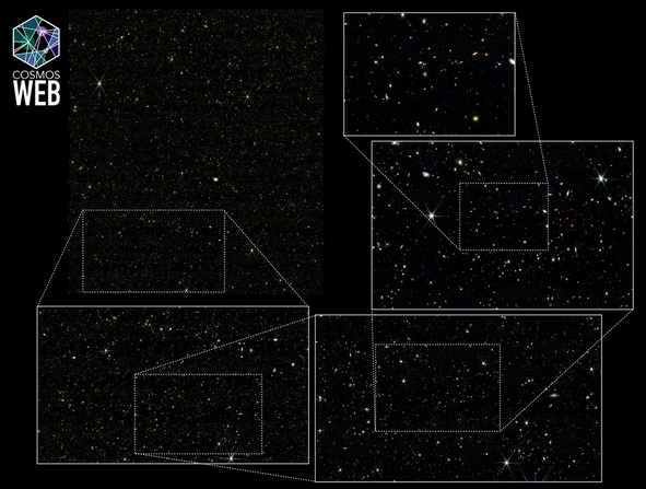 Изображения ранней Вселенной были получены в рамках программы COSMOS-Web. Космический телескоп Уэбб обследовал участок неба, эквивалентный ширине трех полных Лун, которые находятся рядом друг с другом. Это самая широкая область наблюдения телескопа на сегодня. Телескоп сделал более 10 000 изображений и обнаружил почти 800 000 неизвестных галактик, многие из которых существовали на самых ранних этапах истории Вселенной.