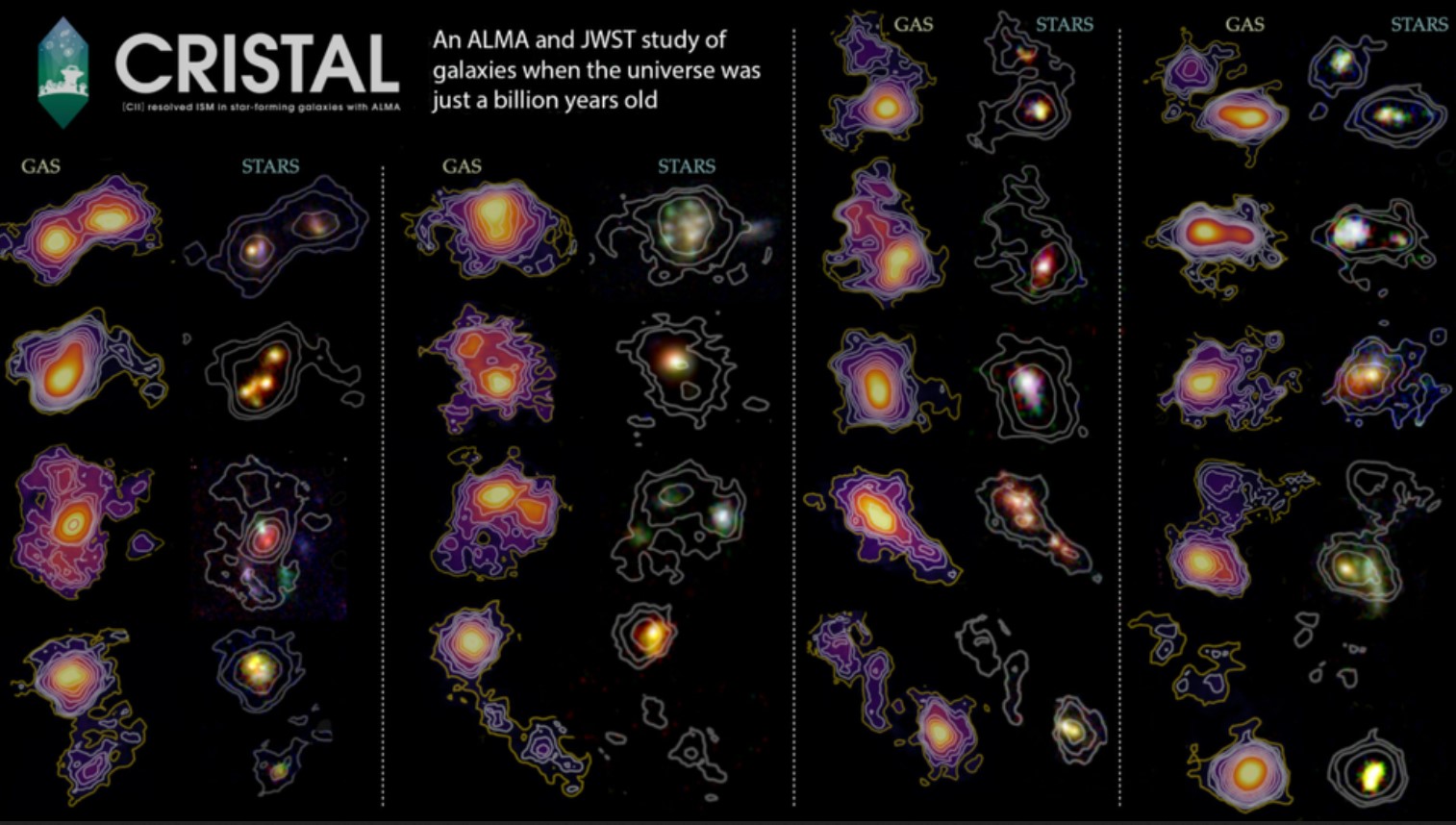 Астрономы провели наблюдение за 39 галактиками в рамках проекта CRISTAL, которые существовали через 1 млрд лет после Большого взрыва. Эти объекты представляют собой популяцию первых галактик во Вселенной. Исследование позволило увидеть, как формировались первые диски галактик, как появились звезды в огромных звездных скоплениях и каким образом межзвездный газ позволил создать современные галактики.