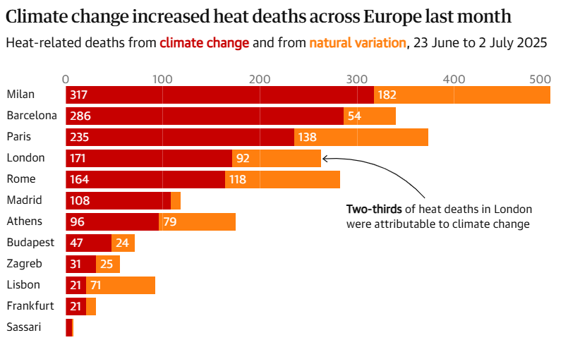 Из-за изменения климата температура в некоторых городах выросла на 4 градуса Цельсия, что привело к увеличению числа смертей на 1500 человек. Число погибших превысило число жертв в результате других недавних погодных катастроф, усугубленных загрязнением ископаемым топливом, таких как наводнения в Испании в 2024 году, унесшие жизни 224 человек, и наводнения в северо-западной Европе в 2021 году, жертвами которого стали 243 человека.