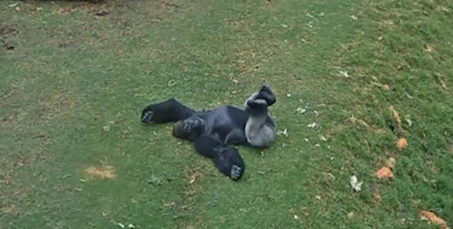 Камерами зоопарка был снят 25-летний самец западной равнинной гориллы Ганьека, который вышел под моросящий дождь, чтобы поваляться в мокрой траве, пишет IFL Science.