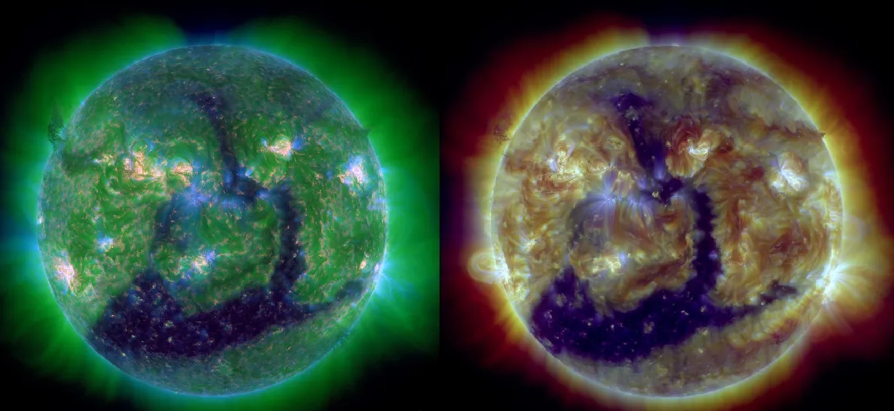 На изображении Solar Dynamics Observatory корональная дыра видна в виде громадного темного пятна, которое тянется по всему солнечному диску. Она находится в верхней части атмосферы Солнца, известной как корона. Корональная дыра темная поскольку плазма в ней холоднее, чем в окружающей короне. Хотя в данном случае понятие "холоднее" довольно относительно, ведь температура плазмы корональной дыры достигает миллиона градусов Цельсия.