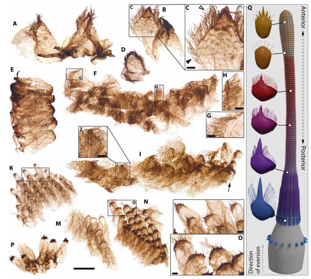 Например, ученые обнаружили у вида червей Kraytdraco spectatus зубы, покрытые сложными нитями, форма и длина которых различалась в зависимости от расположения на теле. Предполагается, что побочные зубы использовались для соскабливания и разгребания поверхности, поднимания частиц пищи с последующей фильтрацией с помощью нитей.