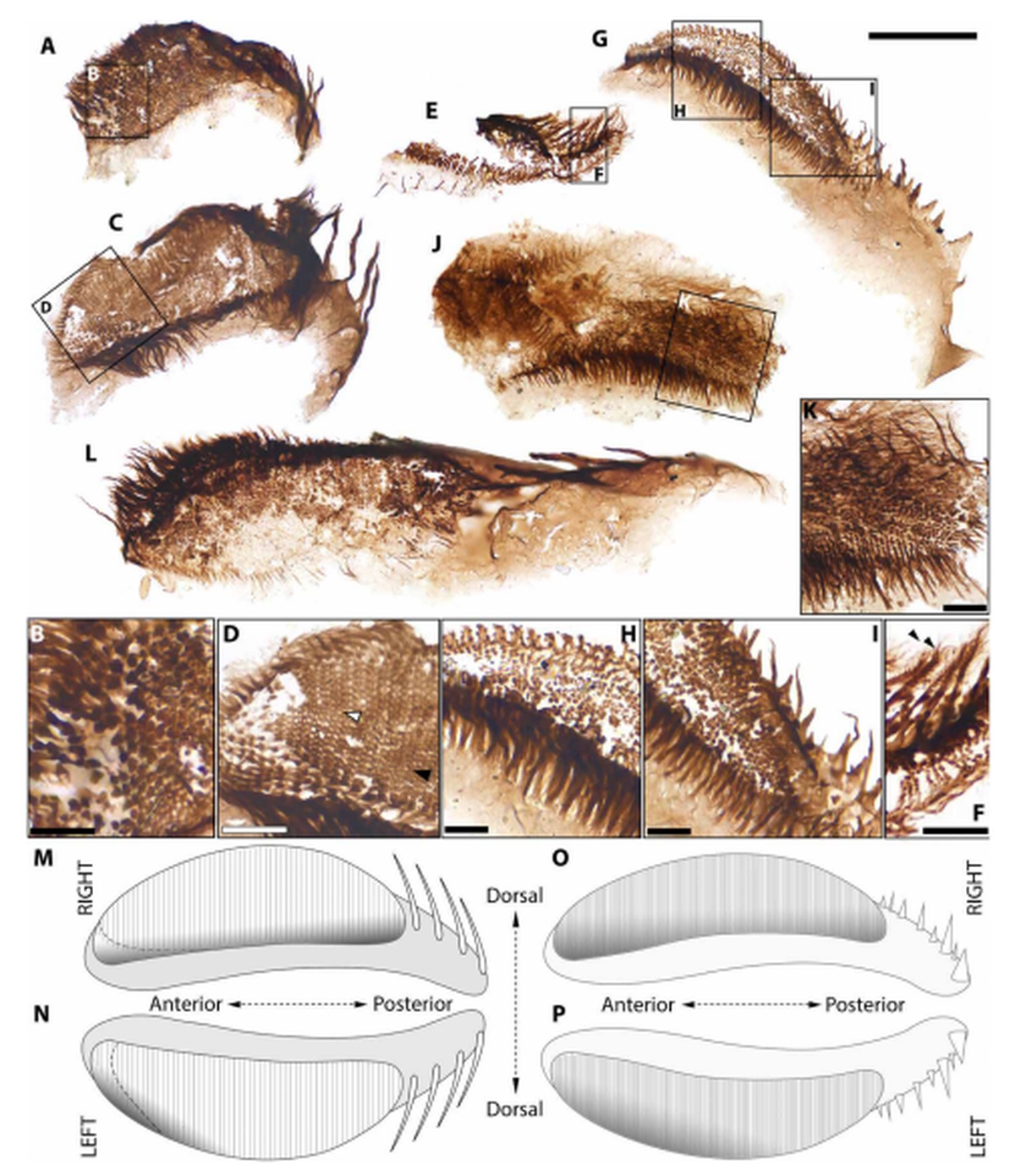 У моллюсков ученые обнаружили ряды лопатообразных зубов, которые, как считается, двигались вперед-назад для соскребания водорослей и микробов с поверхностей.