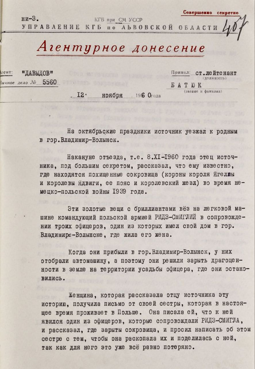 "Накануне отъезда, то есть 8.XI.1960 года, отец источника, под большим секретом, рассказал, что ему известно, где находятся похищенные сокровища (короны короля Ягелла и королевы Ядвиги, ее пояс и королевский жезл) во время немецко-польской войны 1939 года".