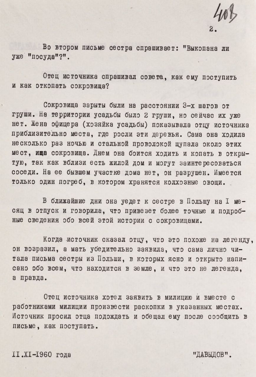 В одной из частей донесения упоминается письмо сестры этой женщины из Польши. Она писала ей, что к ней пришел один из офицеров, сопровождавших Рыдз-Смиглого, и рассказал, где закопаны сокровища, и просил написать об этом сестре, чтобы она раскопала их и поделилась с ней.