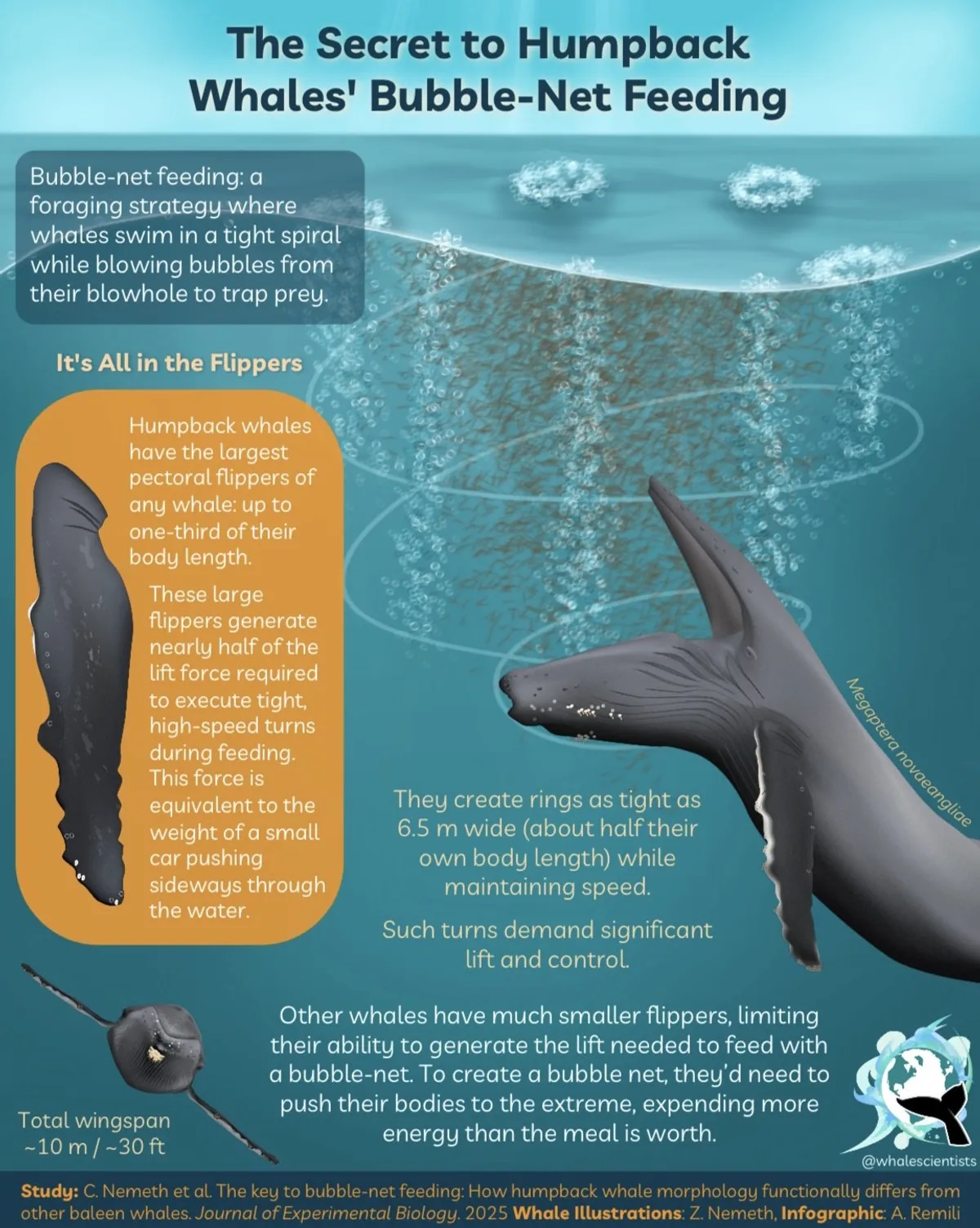 Команде также удалось выяснить то, что секрет успеха стратегии на самом деле кроется в массивных грудных ластах китов. Впрочем, это не стало чем-то неожиданным. Дело в том, что предыдущие исследования морфологии горбатых китов показали, что их ласты повышают маневренность. Однако ученые с удивлением обнаружили, что только они способны к повороту, необходимому для работы пузырчатых сетей.
