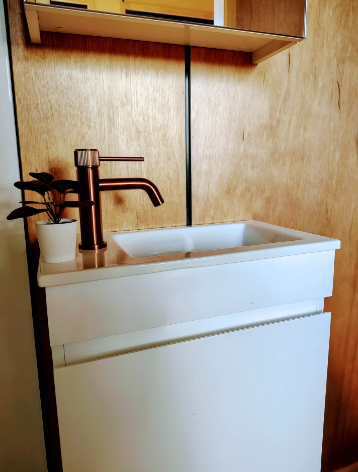 В противоположном конце 6-метрового дома находится ванная комната. Несмотря на то, что эта комната довольно компактна, в ней вместилась маленькая раковина, душ и компостный туалет.