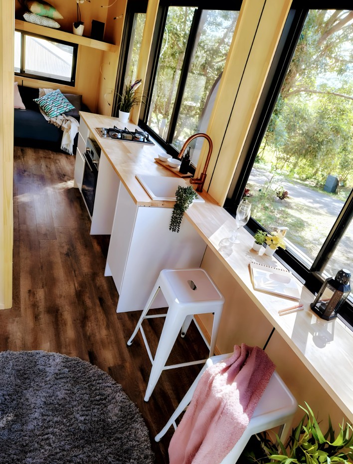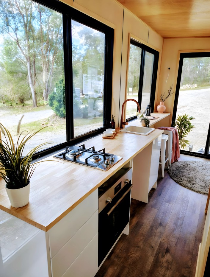 Разработчики признаются, что планировка их дома немного отличается от привычных домов на колесах. Так, в центре маленького дома располагается кухня. Это пространство оборудовано печкой на две конфорки, которая работает на пропане, а также духовкой, раковиной и небольшим количеством шкафов. На кухне даже есть место для установки стиральной машины и холодильника.