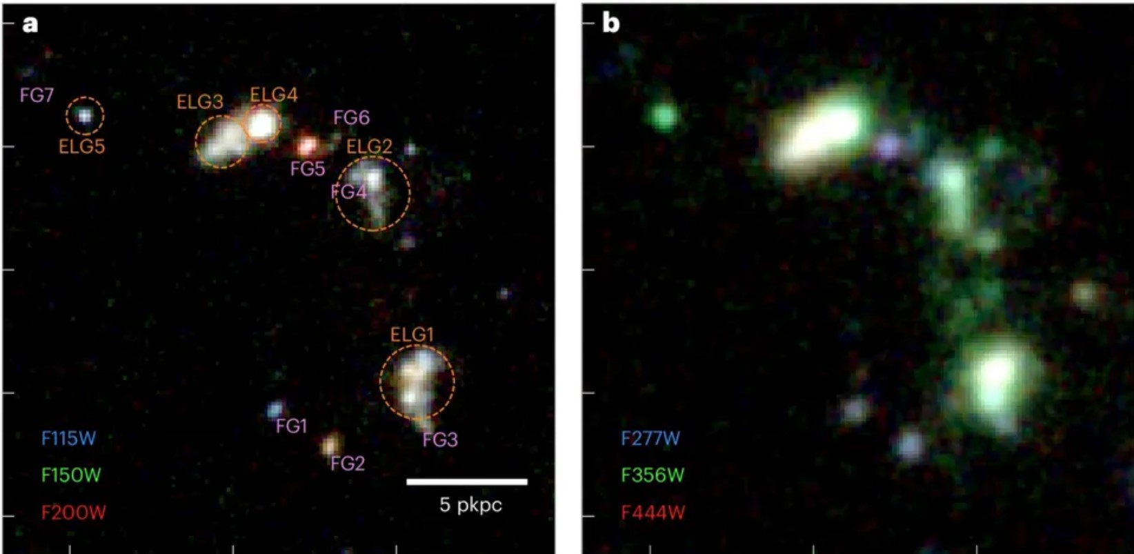 Считается, что примерно 20-30% всех галактик в известной Вселенной находятся в состоянии слияния и постепенного превращения в новую галактику. Но речь идет о слияниях двух галактик. Считается, что только менее 1% слияний происходит с участием нескольких галактик. Поэтому такое событие является очень редким. Астрономам удалось обнаружить с помощью космического телескопа Уэбб слияние сразу пяти галактик, и оно происходило в ранней Вселенной через 800 млн лет после Большого взрыва, то есть 13 млрд лет назад. Эта система из пяти галактик напоминает известный Квинтет Стефана в локальной Вселенной и получила название Квинтет JWST. Хотя каждая галактика по отдельности получила название ELG1, ELG2, ELG3, ELG4 и ELG5. Исследование опубликовано в журнале Nature Astronomy, пишет Live Science.