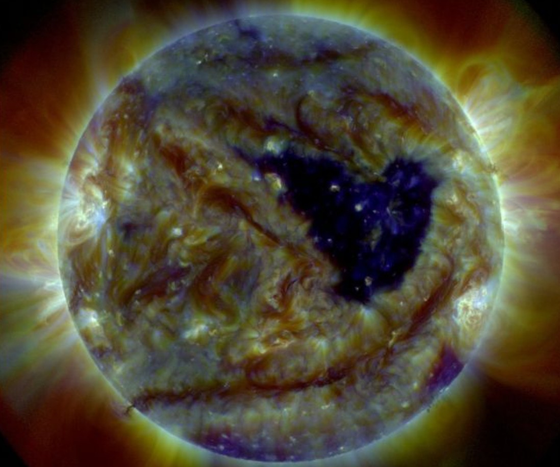 На одной из сторон нашей звезды, которое было обращено к Земле, появилась огромноя корональная дыра, чья форма напоминала огромное сердце. Его размер во много раз превышал саму Земли. Эта корональная дыра пронзила всю Солнечную систему мощным потоком солнечных частиц, пишет Science Alert.