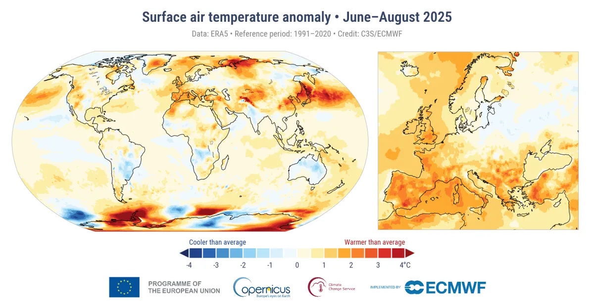 В августе 2025 года, как показывают наблюдения, средняя температуры поверхности моря между 60 градусами южной и 60 градусами северной широты достигла 20,82°C. Это стало третьим самым высоким показателем за месяц с начала наблюдений. Согласно данным Службы по изменению климата Copernicus, этот показатель был всего на 0,16°C ниже рекордного значения августа 2023 года.