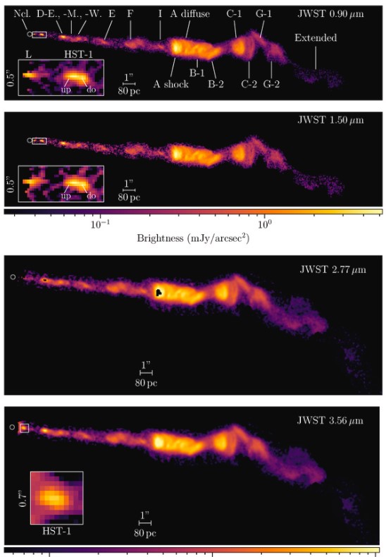 Теперь астрономы с помощью космического телескопа Уэбб более подробно изучили струю черной дыры М87*, в частности ее хорошо известные яркие участки. Также астрономы смогли увидеть почти невидимую вторую струю черной дыры, которая вырывается с ее обратной стороны в противоположном направлении, чем более известная струя.