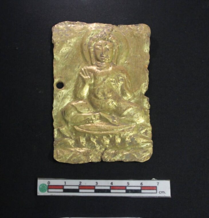 Среди находок выделяется прямоугольный золотой лист шириной 8 сантиметров и высотой 12,5 сантиметров, на котором изображен Будда в витарка-мудре, жесте обучения.