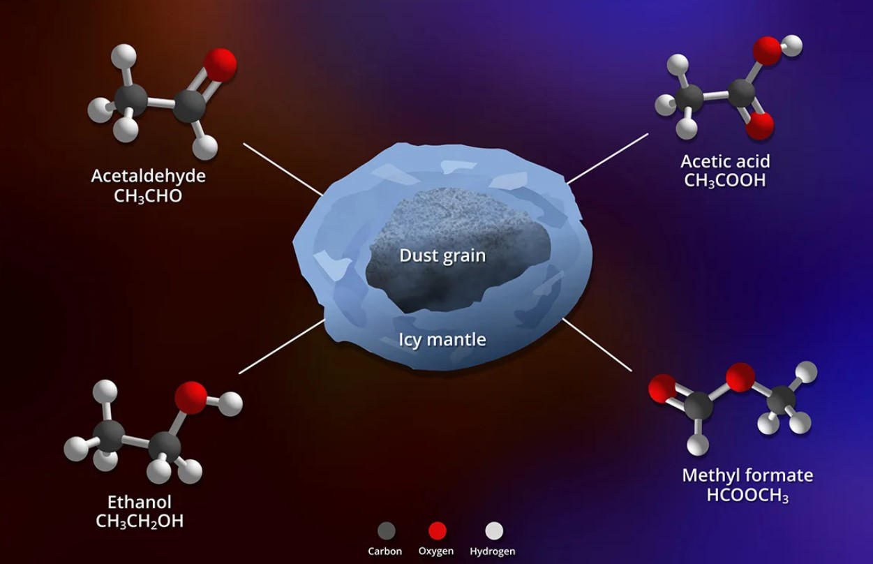 Ученые ранее обнаруживали во льду вокруг молодых звезд, даже в нашей галактике только метанол. Теперь же они впервые обнаружили во льду и остальные сложные органические молекулы за пределами Млечного Пути. Все эти соединения имеют основу в виде углерода.