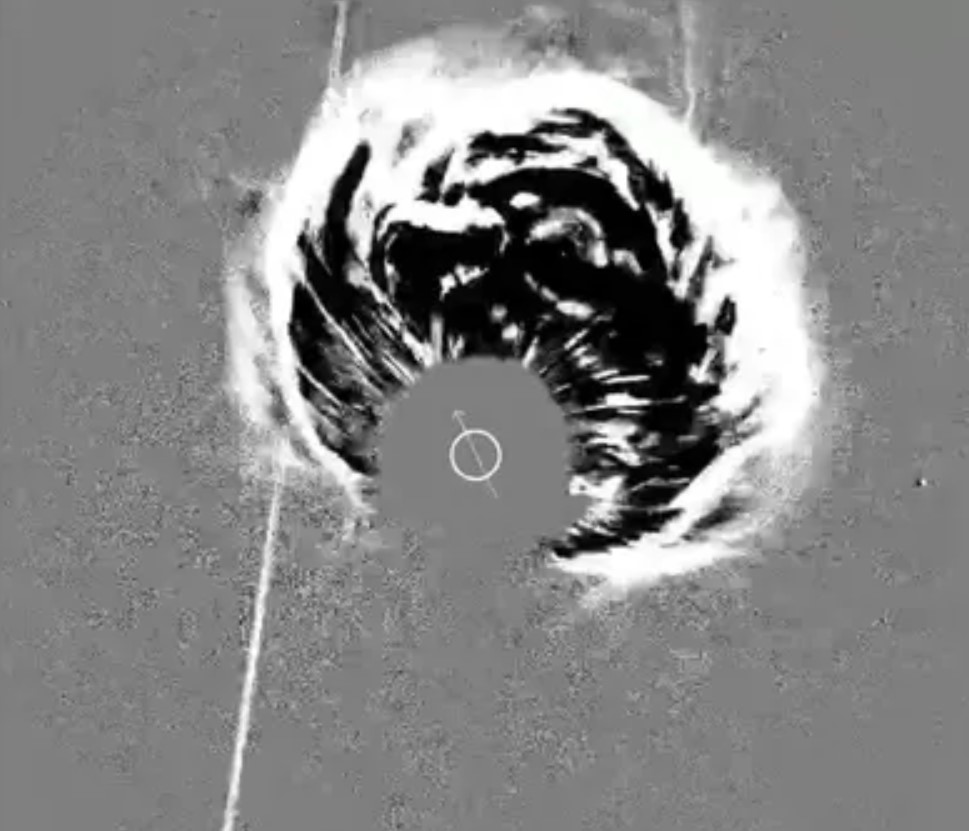 Но коронограф CCOR-1, установленный на борту метеорологического спутника GOES-19, блокирует яркий диск Солнца, чтобы запечатлеть корональные выбросы массы по мере их расширения в космос.