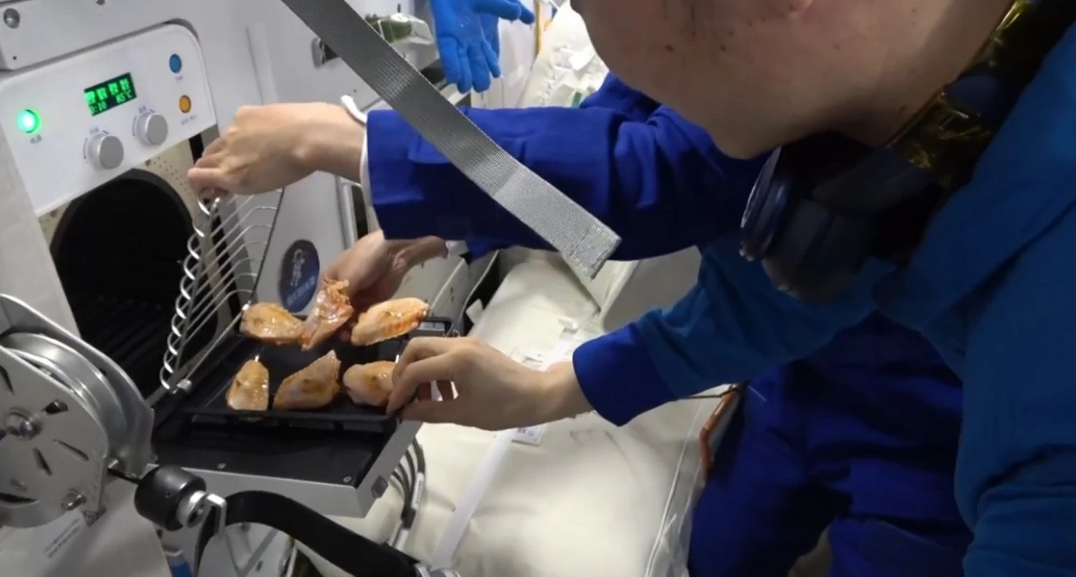 Астронавты на борту китайской космической станции “Тяньгун” впервые в условиях микрогравитации приготовили куриные крылышки и стейки.