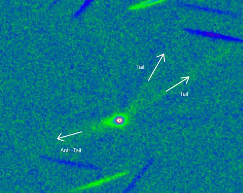 У межзвездной кометы существует два хвоста, а также антихвост. По словам Леба, физика, лежащая в основе антихвоста неясна. Если это обычная комета, то такая особенность может быть связана с выбросом гигантских пылевых частиц. Но эти частицы не могут ускоряться настолько эффективно под влиянием излучения Солнца. Может быть это связано с некоторой странностью кометы, когда ее частицы вылетают не в направлении от Солнца, а к нему.