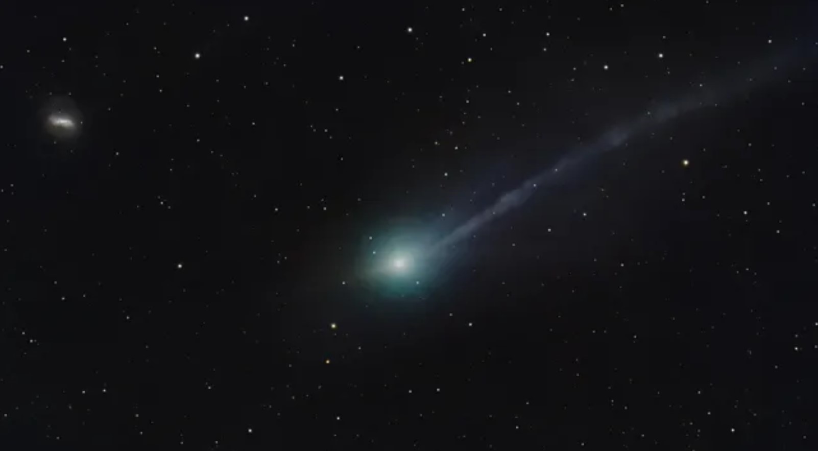 В левом верхнем углу новой фотографии можно увидеть спиральную галактику с перемычкой под названием NGC 4691. Она находится на расстоянии 70 млн световых лет от нас. Но на снимке кажется, что 3I/ATLAS пролетает рядом с этой галактикой.