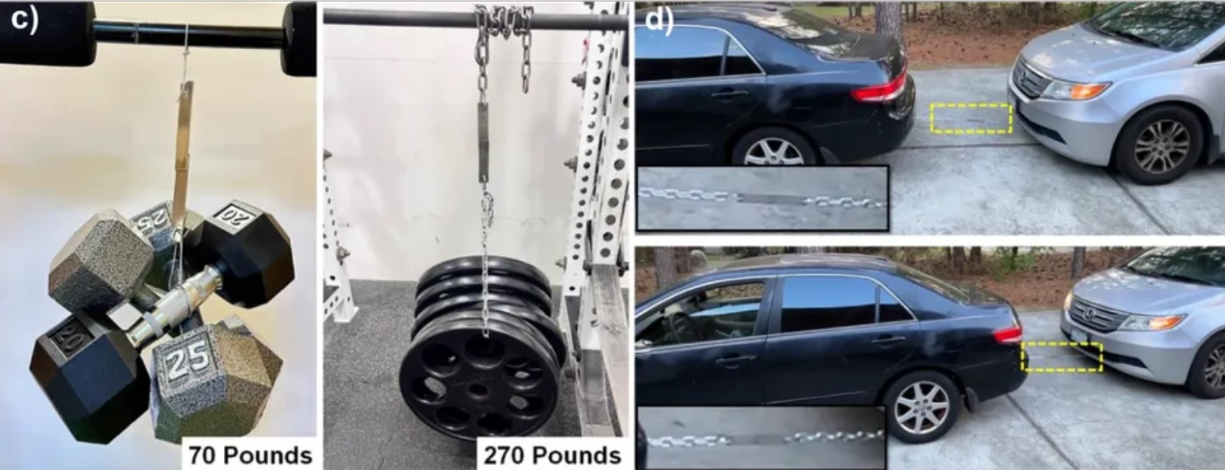 Ученые проверили прочность сцепления полимера, склеив две пластины из нержавеющей стали. Пластины оставались прочно склеенными даже при нагрузке до 123 кг. Буксировка автомобиля по небольшому склону с помощью склеенных стальных пластин также не вызвала никаких проблем. Это делает данные полимеры такими же прочными, как и известные самые прочные клеи.