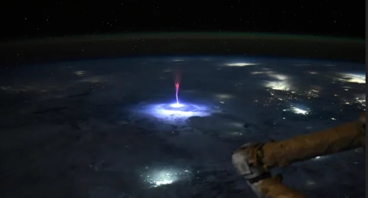 На фотографии показано загадочное световое атмосферное явление, известное как спрайт или красная молния. Спрайты возникают во время чрезвычайно сильных гроз. Если обычные молнии движутся вниз от грозовых облаков к земле, то спрайты движутся вверх, в верхние слои атмосферы нашей планеты.