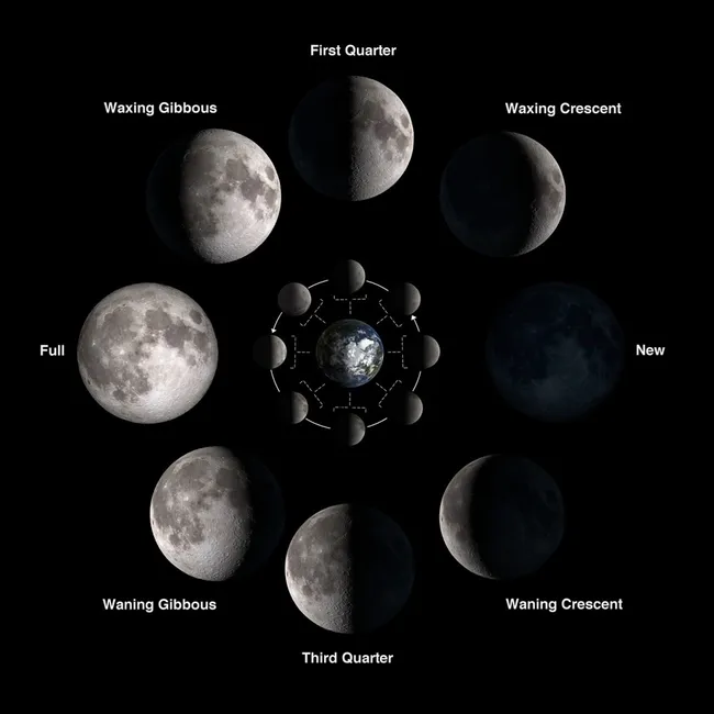 Обычно ученые разделяют 29,5-дневный цикл Луны на восемь отдельных фаз, исходя из того, как Луна, Земля и Солнце располагались относительно друг друга. Цикл начинается с новолуния, когда Луна проходит непосредственно между Землей и Солнцем.
