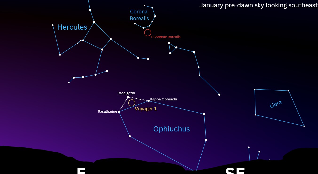 Чтобы найти область неба, в которой находится "Вояджер-1", сначала найдите созвездие Змееносец над восточным горизонтом. Далее найдите яркие звезды: Рас Альхаге, Каппа Змееносца и Рас Альгети, последняя принадлежит созвездию Геркулес. "Вояджер-1" находится в пространстве, ограниченном этой звездной пирамидой.
