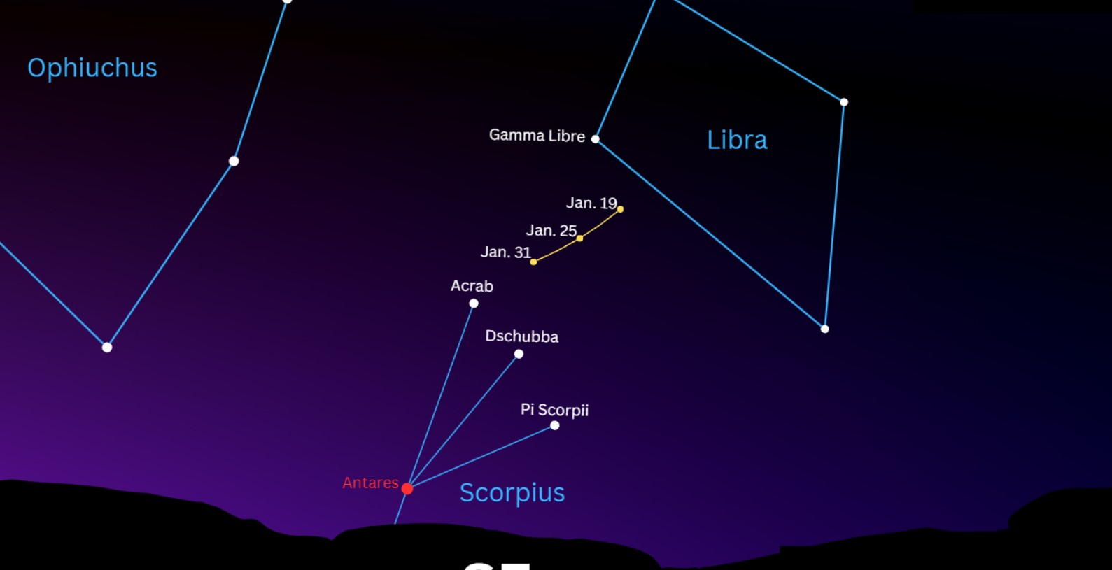 В январе JUICE проходит через участок неба в созвездии Змееносец ниже яркой звезды Сабик, которую можно найти на юго-восточном горизонте. В конце января аппарат отправится к знаменитому астеризму "чайник" в созвездии Стрелец, который можно увидеть над горизонтом на восходе Солнца.