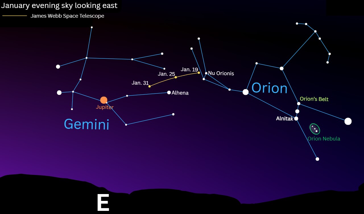 До конца января телескоп Уэбб будет медленно покидать созвездие Ориона Орион и двигаться к яркой точке света, представляющей газовый гигант Юпитер. По пути космический телескоп пролетит близко к яркой звезде Альхена в созвездии Близнецы.