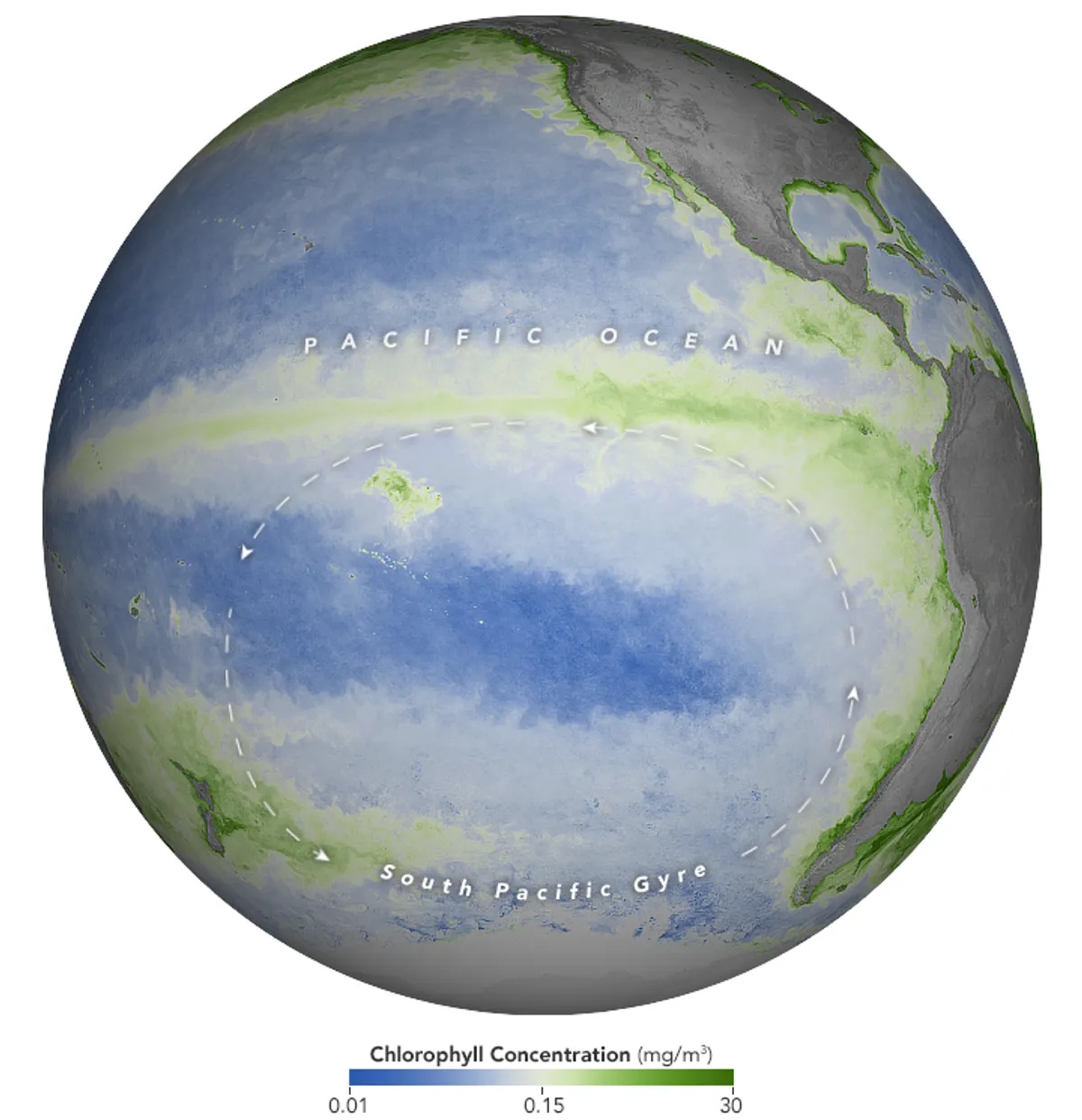 В то же время спутники демонстрируют другую картину: с конца 1970-х годов NASA использует спутниковые данные для измерения цвета океана, что позволяет оценить численность фитопланктона в разных частях океана. Зеленый и желтый цвета указывают на высокое содержание хлорофилла в фитопланктоне; синий — на низкое. В результате исследование 2017 года показало, что большой участок южной части Тихого океана имеет самые обширные и синие воды в мире.