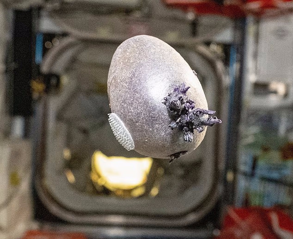 По словам Петтита, он перевозил на борту 72-й экспедиции для своего космического сада — этим он занимался в свободное от работы время. Астронавт отмечает, что на фото запечатлена ранняя фиолетовая картофелина, с липучкой, чтобы ее можно было закрепить в импровизированном террариуме с фитолампой.