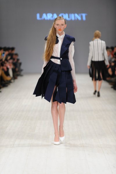 В этом году Лара Квинт участвовала в выставке Origin в Италии - первой платформе, в фокусе организаторов которой оказались не дизайн, а технологии. Бренд Lara Quint был представлен в категории "Ткани", что помогло дизайнеру познакомиться с представителями местных текстильных фабрик. Именно на них Лара и выбрала ткани для будущей коллекции. Дизайнер использовала яркие, неоновые цвета и ломаный, рваный крой. Лара занималась своего рода конструированием нарядов: например, в ее коллекции представлен пиджак, левая часть которого представляет собой полосу ткани, прикрепленную к спине, зато правый – полноценная часть жакета, с пуговицами и воротником.
