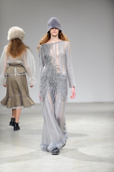 Вязаные юбки, брюки и свитера, полупрозрачная валяная ткань, объемные узоры из нашитых на основное полотно ниток, - от этнической темы в коллекции Червинской остались только формы, напоминающие элементы традиционного украинского костюма, и технологии. Показанная в четвертый день Украинской недели моды коллекция стала итогом совместного с Национальным центром народной культуры "Музей Ивана Гончара" проекта "Истоки". В его рамках дизайнер изучила народную одежду и по старинным технологиям – вязание, валяние, вытынанки – создала новые актуальные вещи.
