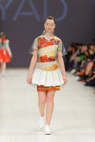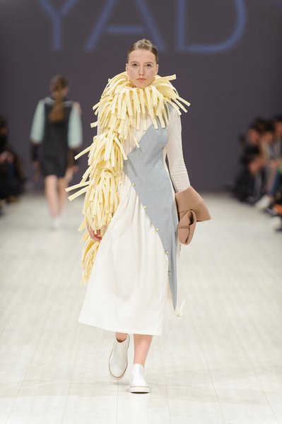 Дизайнер совсем недавно основала бренд YAD, а ее свежие работы посвящены теме фаст-фуда и других вещей, вызывающих зависимости. Не самую оригинальную идею Яна обыграла очень удачно: принты, изображающие бургеров и клоунов, выглядят иронично, а шарф как будто из картофеля фри – это один из именно тех смелых ходов, которые хочется видеть у молодых дизайнеров.