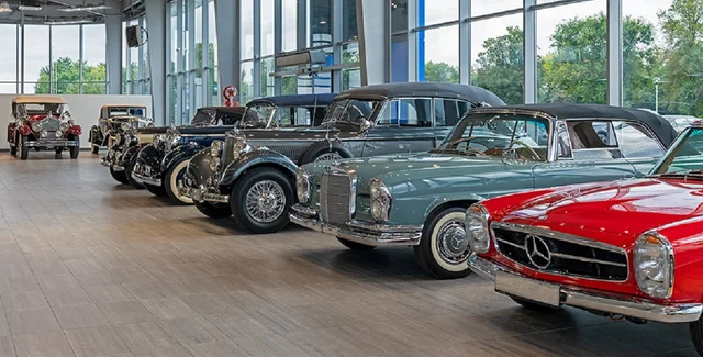 Найбільше у музеї автомобілів Mercedes-Benz. Це довоєнні кабріолети Mercedes 170V, 230 і 320, а також більш сучасні Mercedes-Benz 190 SL 1957 і знаменитий 230 SL Pagoda (він знайомий за фільмом "Достукатися до небес").