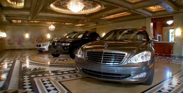 У гаражі — мармурова підлога з величезною мозаїкою, на створення якої пішло два роки. Стіни та дерев'яні гаражні ворота розписані вручну фресками у стилі Ренесансу. Стеля прикрашена позолотою, а дорогі люстри виконані з кришталю.