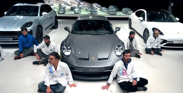 Дев'ять активістів пробралися до павільйону Porsche, приклеїли себе до підлоги та оголосили голодування. Ще шестеро людей розгорнули плакати біля входу в шоурум.