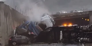 Однак розтягнути пошкоджені машини не вдалося — раптово з мосту на місце ДТП впала ще одна вантажівка. Вона пробила огорожу, злетіла з мосту, приземлившись якраз на розбитий кросовер.