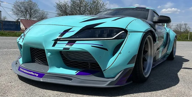 Виставлена на продаж Toyota GR Supra відрізняється ексклюзивним широким кузовним обвісом та яскравим кольором. Автомобіль пофарбований у блакитний відтінок з графікою по всьому кузову.