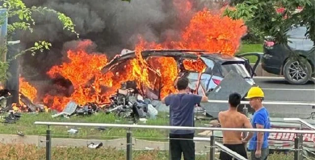 Nio ES8 вилетів із дороги та зіткнувся з купою огороджувальних каменів на узбіччі. Через це виникла пожежа. На місце прибули рятувальники, яким через кілька годин вдалося загасити полум'я.