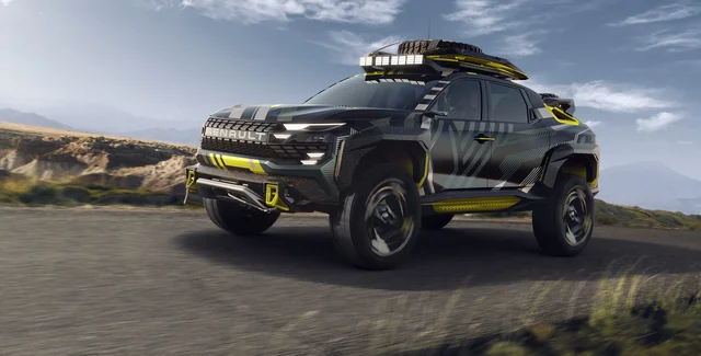 Пікап Renault вирізняється брутальним дизайном із високим капотом і розширеними крилами. Широка решітка радіатора поєднується з тоненькими діодними фарами, а ручки задніх дверцят заховані в стійках даху. У кузові та на багажнику на даху перевозяться запасні колеса.