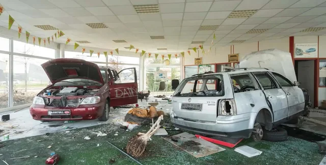 Стан приміщення залишає бажати кращого – воно завалене сміттям та мотлохом. Машини частково розібрані на запчастини вандалами. Водночас на складі досі зберігаються новенькі деталі для різних моделей автомобілів.